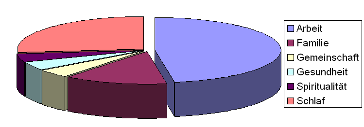 Am besten werden die verschiedenen Bereiche, verteilt über eine Woche, als "Kuchenstücke" in einen Kreis eingetragen. Die Woche hat 168 Stunden. Die Arbeit sollte nicht mehr als 55 Stunden ausmachen, der Schlaf sollte täglich 8 Stunden, also 56 Stunden pro Woche betragen. Es verbleiben also noch 57 Stunden für die andern Lebensbereiche. |